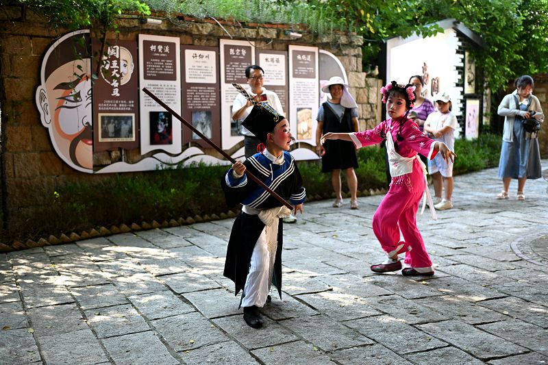 而今,村子裡閩南紅磚古厝與戲檯交錯,猶如一座「活態戲劇博物館」。海內外遊客不僅可以「變裝」打卡,化身戲曲經典角色穿梭其間,還可走進稻田「開盲盒」、在磚雕上「唱戲」,沉浸式感受閩南傳統戲曲魅力。