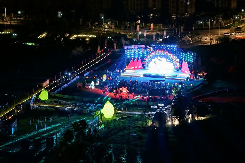 以高甲戲頭飾為靈感設計的舞台搭建在寬闊的稻田間,台下圍坐著不少村民和遊客,時不時發出陣陣掌聲與喝彩。