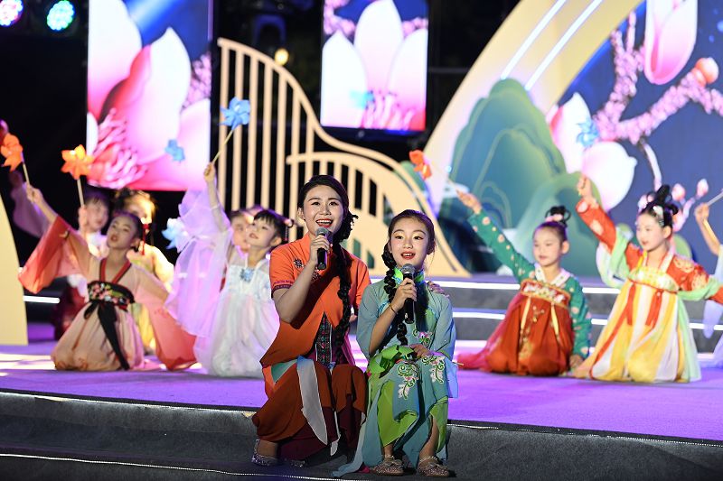 9月28日晚,第六屆海峽客家中秋晚會在福建省龍岩市龍津湖公園舉行。圖為來自梅州的李詩琪(左)和陳思霖演唱新客家山歌《八月十五月光光》。中新社