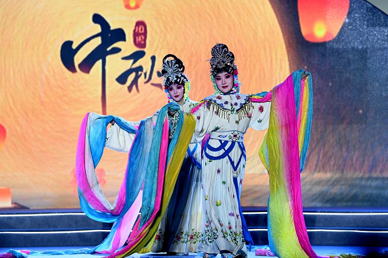 9月28日晚,第六屆海峽客家中秋晚會在福建省龍岩市龍津湖公園舉行。圖為情景表演《霓裳奔月》。中新社