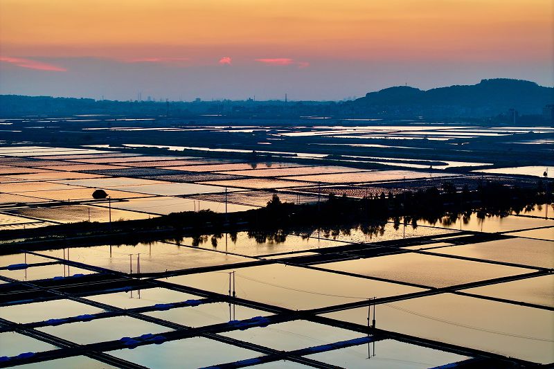 10月5日,落日餘暉下的福建莆田鹽田美不勝收。莆田萬畝鹽田在陽光、海風中展現斑斕的色彩,宛如大地調色板。莆田鹽場有著近千年的海鹽生產歷史,至今仍遵循古法曬鹽技藝。(中新社)