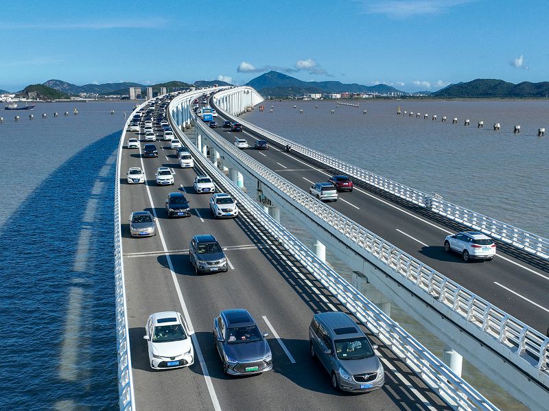 在浙江省舟山市普陀區,返程車輛行駛在朱家尖海峽大橋上(無人機照片)。