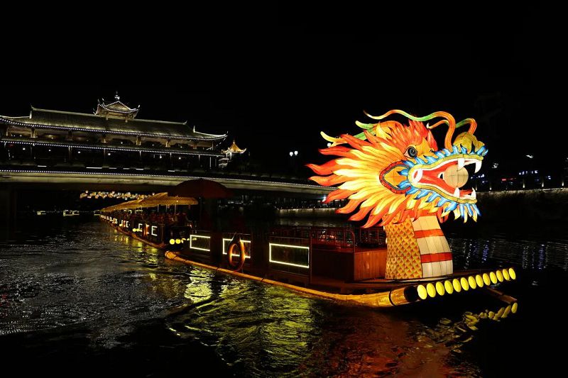 10月1日晚,十里金溪華彩初綻。一條巨型龍形遊船輕漾於碧波之上,流光溢彩映照出客家夜色,成為泰寧文旅新地標。當地創新推出「魔術+脫口秀進遊船、進景區」演繹活動,打造「以文入景」的沉浸式體驗。