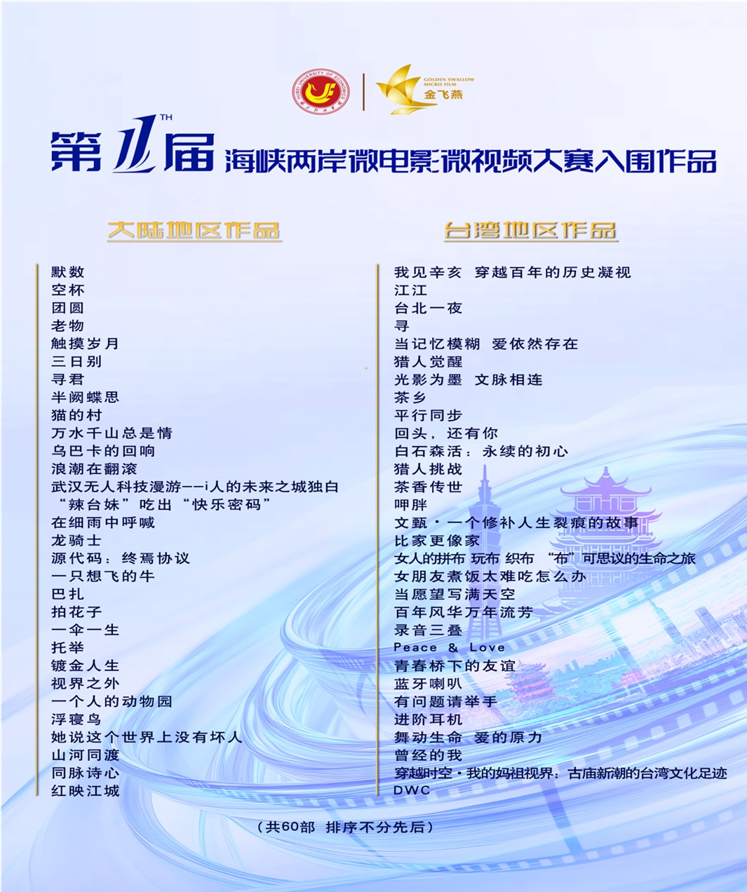 2025年10月1日,第十一屆「金飛燕」海峽兩岸微電影微視頻大賽入圍名單在武漢正式揭曉,大賽評委嚴格按照評分標準和推選規則,經過分組審片、交叉審片、專家評議等程式,層層篩選,以投票的方式評選出60件入圍提名作品,這些作品將進入大賽終評環節。