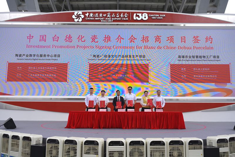 推介會上,「陶瓷+」動漫文化產品研發生產項目、高端農業智慧植物工廠項目、陶瓷產業數字化服務中心項目、「AI+」陶瓷產品應用生產項目、「一座城一個APP」城市數字化服務平台項目、陶瓷智能機器人「數字應用場景」開發項目、「陶瓷+」互聯網產業公共服務平台項目順利簽約,總投資53億元,為德化經濟社會發展注入強勁動能。本屆廣交會,德化組織了114家次陶瓷企業在展館A區、B區設置266個展位,並組織30多家企業在錦漢展覽中心同步設置近2000平方米的展區,全面展出具有非遺技藝、現代設計與實用功能的各類陶瓷精品,吸引了眾多客商駐足觀賞,洽談合作。
