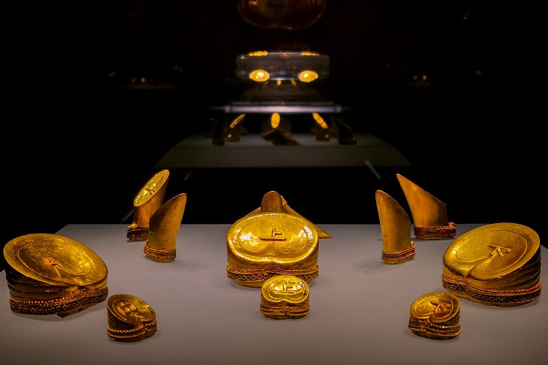 2011年,考古工作者在此喚醒沉睡兩千年的海昏侯國:總重 120 公斤的馬蹄金、麟趾金、金板金餅熠熠生輝。200 萬枚五銖錢堆積如山,總重竟有十餘噸。那邊廂,孔子衣鏡照見儒風,青銅火鍋氤氳尚溫,劉賀私印沉靜如眸……彷彿一顆漢朝時空膠囊,被悄然開啟,將兩千年前的繁華氣象,全然展露於今人眼前。