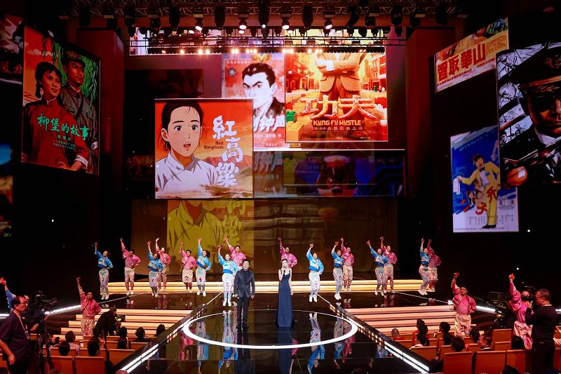開幕式上,演員黃渤、周冬雨點亮金雞。據悉,今年開幕式的「點亮金雞」環節採用中國國內少見的超大飛幕裝置,回歸電影銀幕概念,並讓120幅人工智能生成的經典電影專屬海報在屏幕上浮現,匯成中國電影發展的壯闊圖景。