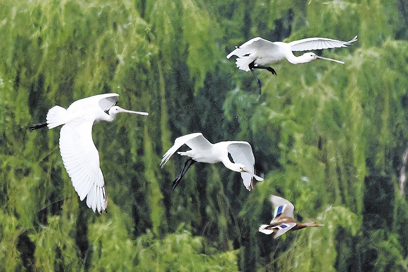 「我們提前預約進綠心濕地園,就是為拍白琵鷺一家。這些年來隨著環境改善,不少白鷺在大運河附近安家,但對棲息環境要求更高的白琵鷺還很少見。」