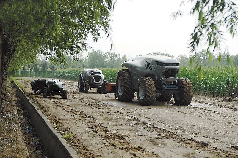 其中最顯眼的是名叫鴻鵠T200的「大塊頭」。銀灰色車身活像一隻巨型甲殼蟲,頂上沒有駕駛室,因為它完全不需要人駕駛。後輪直徑超1.8米,車身高達3米、長約5.7米,很是威武。車尾裝著掛鉤,能根據不同農時更換農機具。「它相當於火車頭,拉著後邊的『車廂』在地裡跑。」王孟軒笑著說。