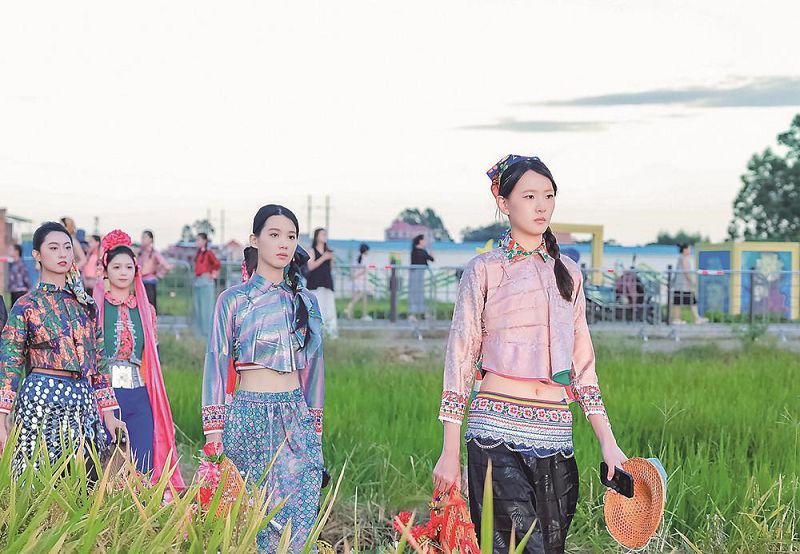 在沉浸式光影中,模特們緩步而來。黃斗笠、花頭巾、短上衣、寬筒褲、銀腰帶……這一刻,這些蘊含著地方記憶與情感的傳統服飾元素與現代剪裁和創新面料交相輝映,傳統非遺與當代設計攜手走進了大眾生活。
