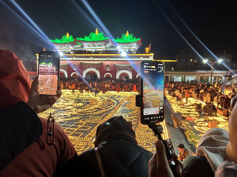 塔爾寺外,工匠們沿街售賣手工酥油燈的傳統依舊延續。而寺內,跟隨年輕人的鏡頭,古老的酥油燈不再祗照亮寺院角落,更在線傳遞著藏傳佛教千年的智慧與溫暖。(中新社)