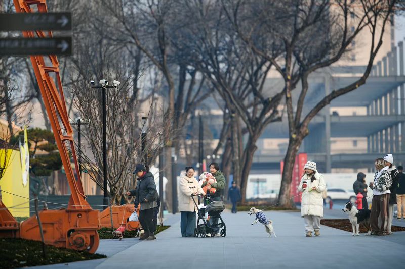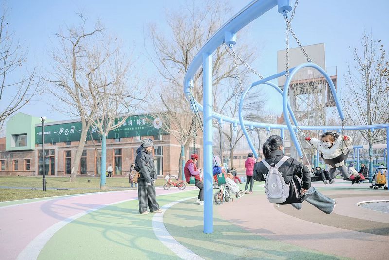 12月17日,天津河東區「津一·Park」園區,市民帶著孩子在蕩鞦千,園區因地制宜引入多樣化業態,融入兒童友好、寵物友好等生活場景。中新社