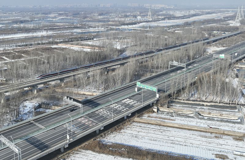 2023年12月28日,京雄高速公路(北京段)五環至六環段開通。圖為當日「復興號」高鐵列車從京雄高速旁駛過。(無人機照片) 中新社