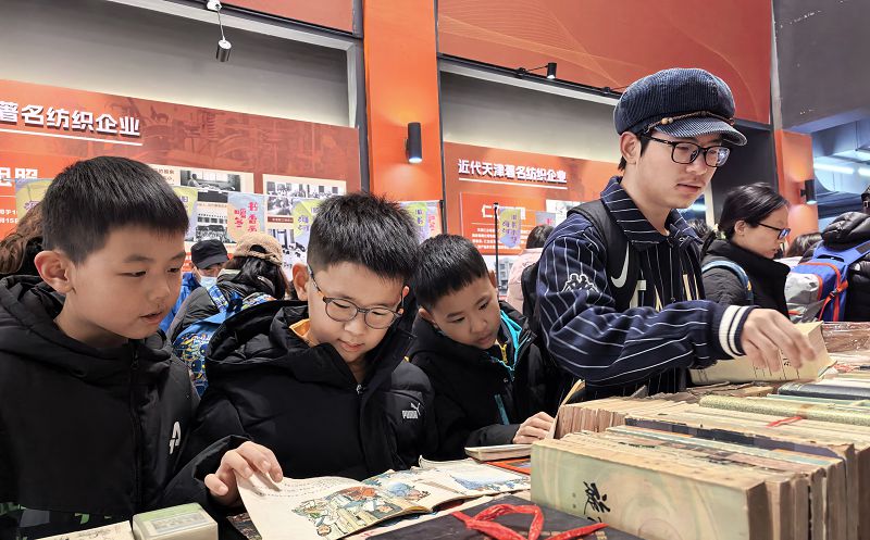 12月28日上午,天津市河東區棉3創意街區的「海河舊書市集」上,小學四年級學生段霖峰和夥伴一起淘書。中新社