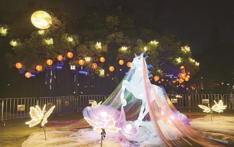 海滄金沙書院的草坪上,一匹粉紅「花馬」驚艷亮相。導報記者在現場看到,粉艷的花瓣綴滿馬身,彷彿從花海中漫步而出,溫柔又靈動,國風感十足。據建設方介紹,這尊名為「馬上生花」的燈組,以廈門市花三角梅為創意核心,燈組高度接近8米,搭配周圍散落的「春花納福」花燈,將閩南年味與馬年吉祥寓意完美融合。正在附近遛彎的市民李阿姨停下腳步,笑著說:「我家就住這附近,每天來散步都能看見這匹花馬,越看越好看,今天我帶小孫子來拍照,隨手拍都好看!」