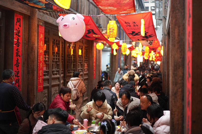大陸視窗 重慶中山古鎮擺「千米長宴」 市民遊客共品濃濃年味 臺灣導報 2026-02-10 0 comments 閱讀數 : 76 2月7日,重慶市江津區中山古鎮舉行「千米長宴」,融合民俗、非遺巡遊表演等活動,吸引眾多市民和遊客前來感受濃濃年味。「千米長宴」是江津中山古鎮春節期間延續多年的特色民俗活動,最初由古鎮居民為節日期間滯留的商販、遊人免費提供食宿,後逐漸演變為祈福團圓的年節傳統。古鎮街巷綿延逾千米,「千米長宴」由此得名,並沿襲至今。圖為中山古鎮「千米長宴」現場,一位老人通過「打盆」技藝頭頂木托盆傳菜。(中新社) 圖為舞龍巡遊表演。 中新社 民眾在中山古鎮品嚐「千米長宴」。 Post navigation Previous: 【福建品牌專刊】千年政和蘊奇珍 品牌引領啟新程Next: 福建福清「巴掌田」變「聚寶盆」 智慧種養促增收 相關報導 大陸視窗 福建古村年味濃 鄉俗雅趣鬧新春 臺灣導報 2026-02-10 0 大陸視窗 福建三明台青創業基地 舌尖上的融合,創業中的同心 臺灣導報 2026-02-10 0 大陸視窗 北京街頭年味濃 臺灣導報 2026-02-10 0