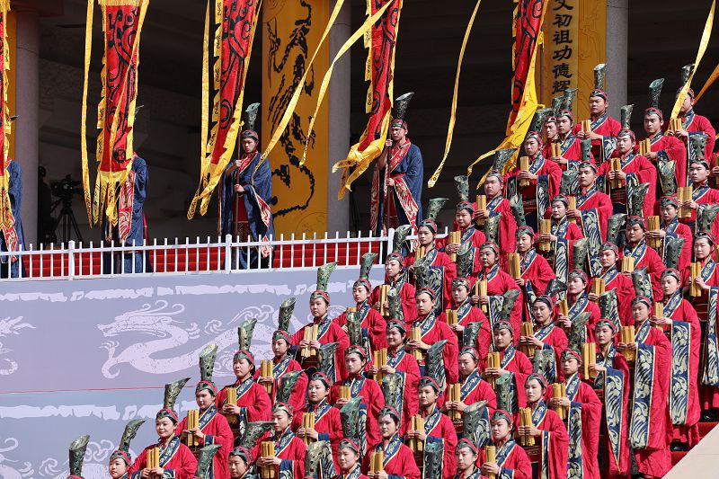 上午9時50分,伴著「九五之尊」的寓意,公祭典禮正式啟幕。現場集體肅立,擊鼓九通,鳴鐘九響,渾厚的聲響在山谷間迴盪,訴說著華夏兒女對先祖的崇敬。