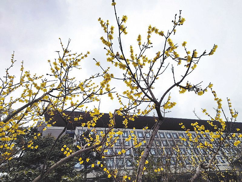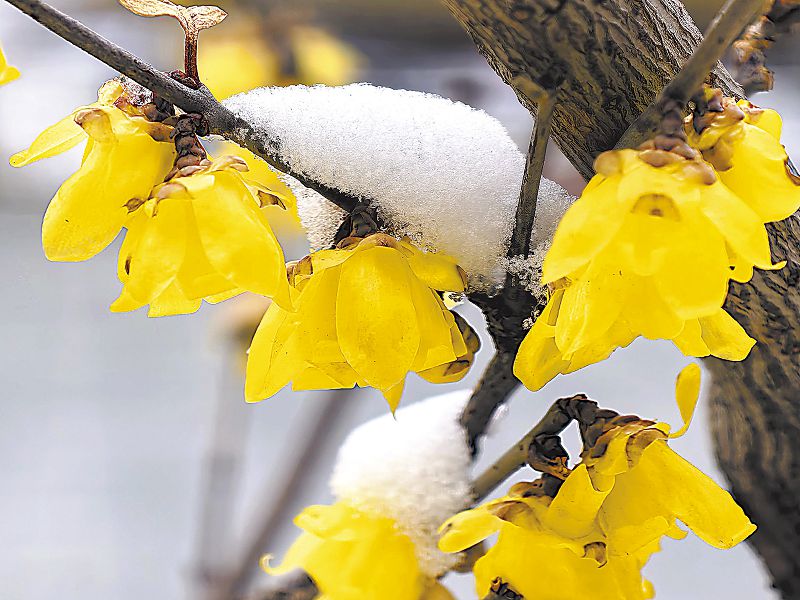 春雷乍動,春雪漸融,城市副中心的花木煥發出春日生機。圖為臘梅映雪。洪華中/攝