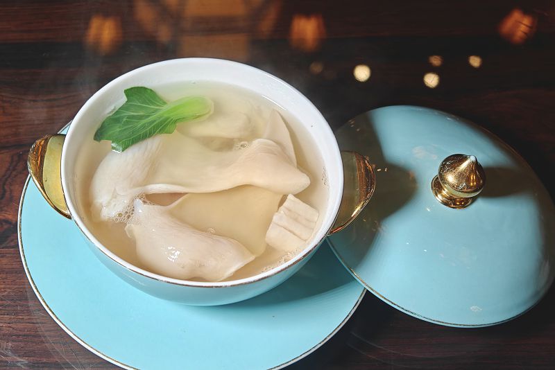 在瀰漫著高湯香氣的廚房內,年近六旬的陳輝手持長勺,眼神專注地盯著鍋中澄澈的雞湯。他說,這道湯品的精髓的在於「三茸雞湯」的慢燉與漳港海蚌的鮮醇,需選用兩年以上老母雞、牛裡脊、豬裡脊,按1:1:1比例剁茸製成絨團,放入雞湯中慢煮吸附雜質,再經多層過濾去油,最終湯色清亮可鑒,即為「鼎湯」。