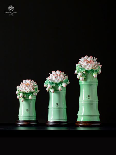 《虛谷長馨》之荷花以德化白瓷為材質,竹節為主體,荷花為創作元素;竹節綠色基調,寓意虛心向上、節節高;荷花手工捏制,取意「出淤泥而不染」。這不是簡單的元素堆砌,而是將中國傳統文化中的「四君子」意象與當代審美融合。