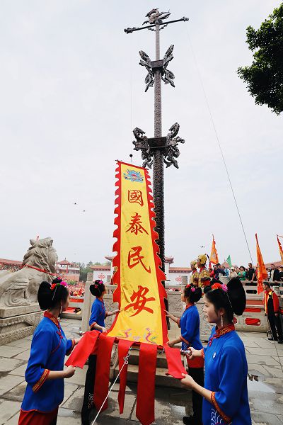 10時許,「天下媽祖回娘家」啟動儀式正式啟幕。升幡手、掛燈手、旗手、號手及護幡湄洲女依次就位。隨後,號聲長鳴,兩面繡有「天上聖母」的幡旗與18盞紅燈籠緩緩升起。
