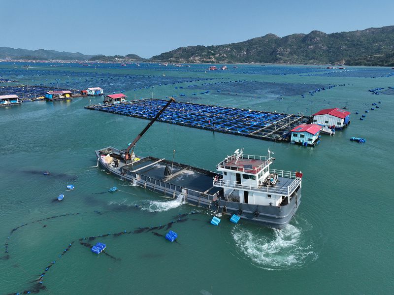 在福建省寧德市霞浦縣下滸鎮海上養殖區,養殖戶將大黃魚魚苗投放至漁排。