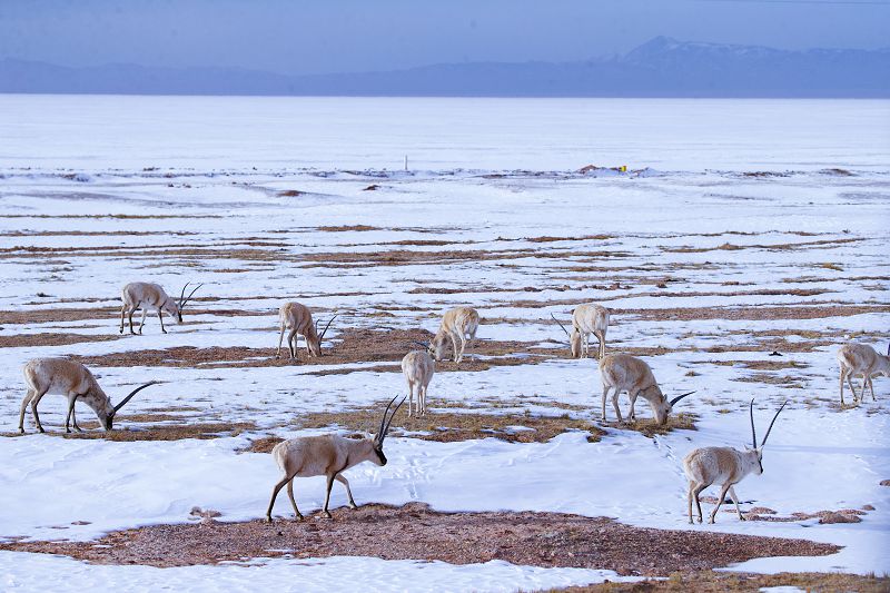 2023年3月25日,成群的藏羚羊在位於青海省玉樹藏族自治州的可可西里覓食。